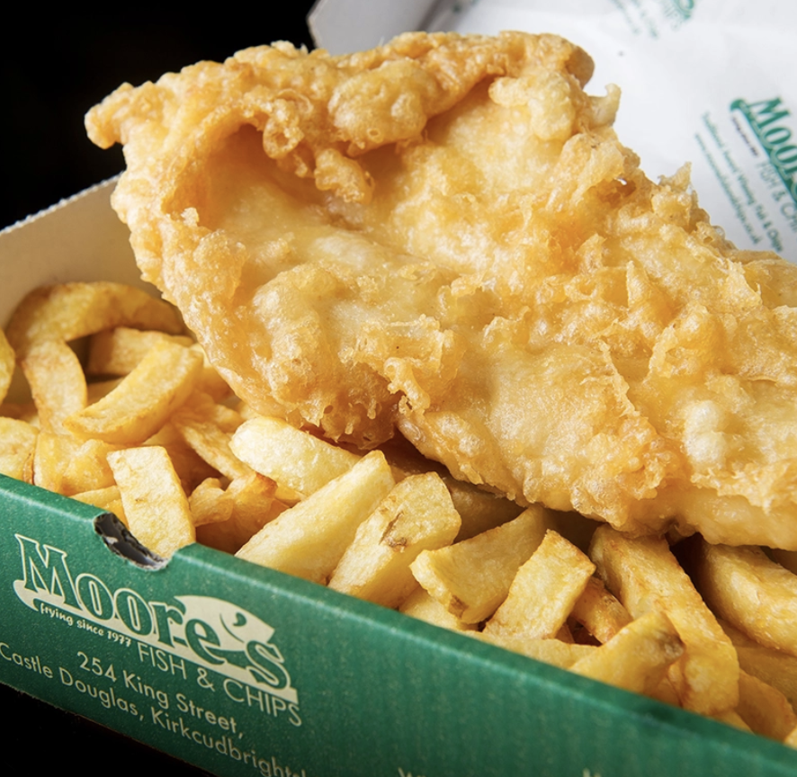 Moore’s Fish & Chips in Castle Douglas is a proper Scottish chippy with serious bragging rights – golden, crispy fish that’s fried to perfection, chunky chips you’ll want to dive into, and that unmistakable seaside smell (minus the seagulls nicking your food). It’s family-run, proudly local, and has been serving up award-winning suppers for over 35 years. Whether you’re after a haddock feast, a cheeky sausage supper, or just fancy a taste of nostalgia wrapped in paper, Moore’s is the kind of place that makes you rethink every soggy chip you’ve ever had elsewhere.